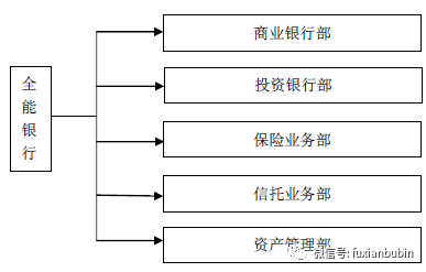 從全能銀行的組織架構(gòu)上來看,一般來說,其內(nèi)部會(huì)設(shè)置平級(jí)的金融業(yè)務(wù)部門,全面經(jīng)營商業(yè)銀行、投資銀行、保險(xiǎn)、信托、資產(chǎn)管理等項(xiàng)業(yè)務(wù),多種業(yè)務(wù)混合、交叉經(jīng)營,并實(shí)行一級(jí)法人制。在這種模式中銀行是一種名副其實(shí)的金融百貨公司,客戶只要到銀行來,所有的金融業(yè)務(wù)都可在此辦理。商業(yè)銀行及證券承銷業(yè)務(wù)就像一家大型百貨公司內(nèi)部兩個(gè)不同部門,其規(guī)模經(jīng)濟(jì)效應(yīng)最為明顯。