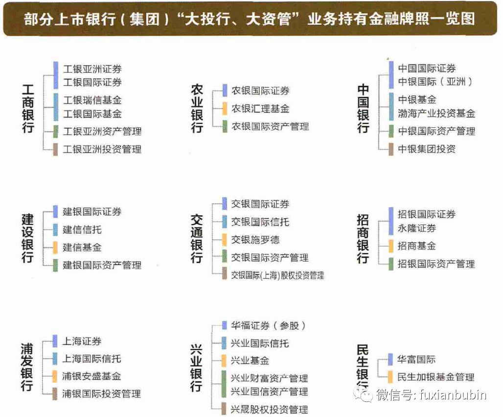 在金融市場化和去杠桿的大背景下,經(jīng)濟(jì)發(fā)展方式的轉(zhuǎn)變和結(jié)構(gòu)調(diào)整必然引發(fā)社會(huì)融資結(jié)構(gòu)的深刻變化,由此導(dǎo)致原先以銀行信貸資金凝結(jié)而成的經(jīng)濟(jì)結(jié)構(gòu)體系發(fā)生顛覆式調(diào)整,跨業(yè)、跨界經(jīng)營為銀行業(yè)提供了巨大的發(fā)展空間,在既有的分業(yè)監(jiān)管、分業(yè)經(jīng)營格局下,各家銀行在合法合規(guī)的基礎(chǔ)上,借助直接、間接控股或集團(tuán)內(nèi)關(guān)聯(lián)的方式,將券商、信托、基金、資產(chǎn)管理公司、股權(quán)投資公司的金融牌照進(jìn)行整合,開辟新的增長空間,推動(dòng)銀行轉(zhuǎn)型發(fā)展,而圍繞相關(guān)業(yè)務(wù)搭建的金融集團(tuán)框架也日漸成型:
