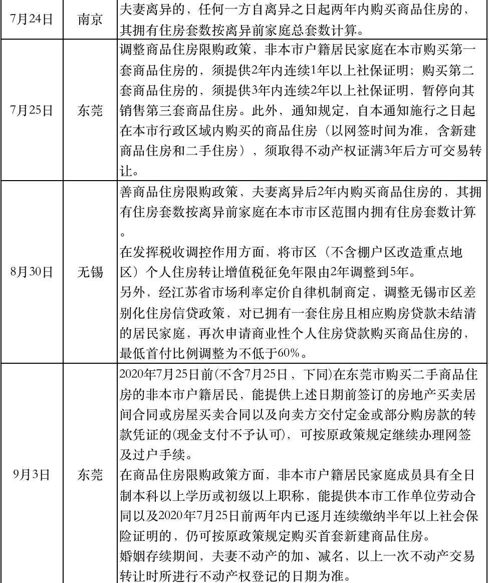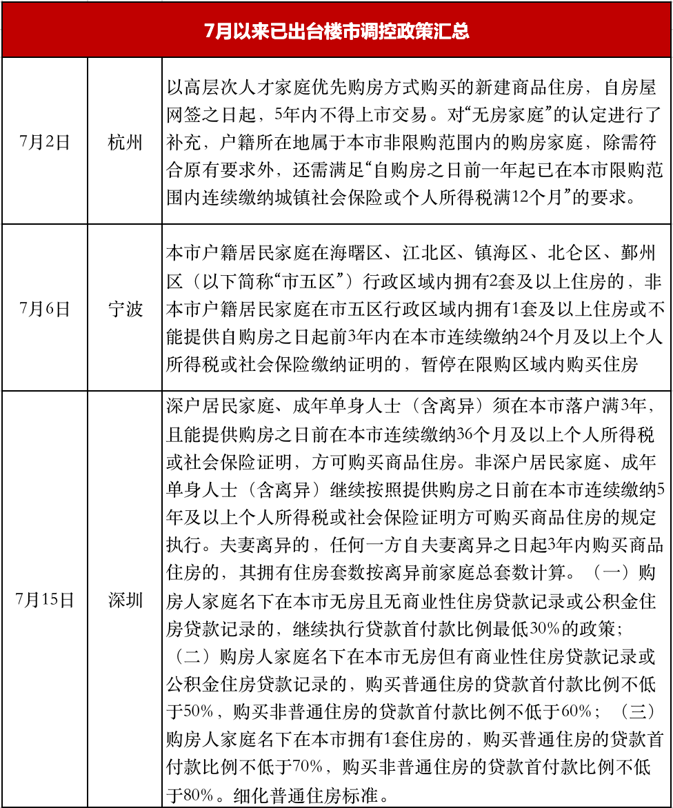 隨后,浙江臺州、麗水、海鹽等多個三四線城市發(fā)布樓市調(diào)控政策,掀起了新一輪三四線城市調(diào)控新周期。自7月熱點二線城市紛紛加碼調(diào)控至今,地方因城施策,調(diào)控正逐漸深入至三四線城市,未來調(diào)控大概率將繼續(xù)維穩(wěn),以更好地落實穩(wěn)地價、穩(wěn)房價、穩(wěn)預(yù)期的長期目標(biāo)。