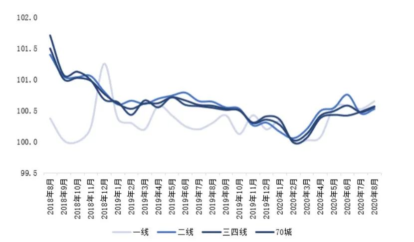圖:2018年8月以來70城及各能級城市新建商品住宅價格指數(shù)環(huán)比走勢