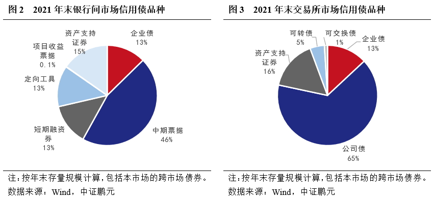 信用債規(guī)模上,銀行間市場相對交易所市場仍保持一定優(yōu)勢,但兩市的規(guī)模差距逐步在縮小。2021年末銀行間市場信用債債券存量規(guī)模17.67萬億元、交易所市場信用債債券存量規(guī)模15.04萬億元,為銀行間的85%,該比例在2019年末為76%。由于銀行間市場(超)短期融資券以滾續(xù)發(fā)行為主,發(fā)行量較大,銀行間信用債發(fā)行規(guī)模遠(yuǎn)超交易所市場。2021年銀行間信用債發(fā)行規(guī)模10.18萬億元、交易所信用債發(fā)行規(guī)模5.39億元,為銀行間的53%。此外,截至2021年末,交易所存量公司債發(fā)行主體數(shù)量3,192家,已超過銀行間市場存量信用債發(fā)行主體數(shù)量2,804家。