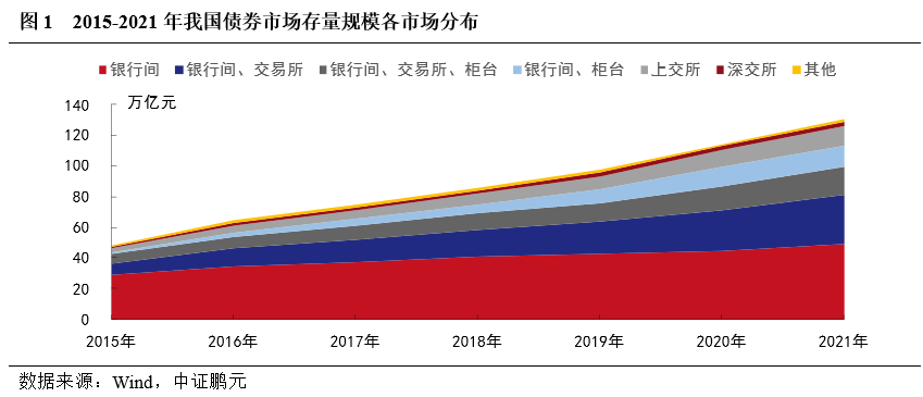當(dāng)前,我國債券市場以銀行間市場為主、交易所市場為輔的市場結(jié)構(gòu),隨著近年來交易所債券市場不斷擴(kuò)容,其市場債券規(guī)模占比逐年攀升。銀行間債券市場上市券種主要包括國債、地方政府債、同業(yè)存單、金融債(以銀保機(jī)構(gòu)債為主)、政府支持機(jī)構(gòu)債、企業(yè)債、中期票據(jù)、短期融資券、定向工具、項(xiàng)目收益票據(jù)、ABN、銀保監(jiān)會ABS;交易所債券市場上市券種主要包括國債、地方政府債、金融債(以證券公司債為主)、政府支持機(jī)構(gòu)債、企業(yè)債、公司債、可轉(zhuǎn)債、可交換債、證監(jiān)會主管ABS。其中,國債、地方政府債券、金融債、企業(yè)債等為跨市場交易債券品種。至2021年末,我國債券市場存量130.43萬億元,在銀行間債券市場(不含跨市場)上市的債券存量規(guī)模63.35萬億元,占總存量規(guī)模的49%,在交易所債券市場(不含跨市場)上市的債券存量規(guī)模15.46億元,占總存量規(guī)模的12%,在銀行間和交易所跨市場上市的債券存量規(guī)模約50億元,占總存量規(guī)模的38%,跨市場債券品種也大多由銀行間市場為主。近年來,隨交易所信用債市場擴(kuò)容,交易所債券市場(不含跨市場)存量規(guī)模對總存量規(guī)模占比逐年攀升,由2015年的6%上升至2021年年末的12%。