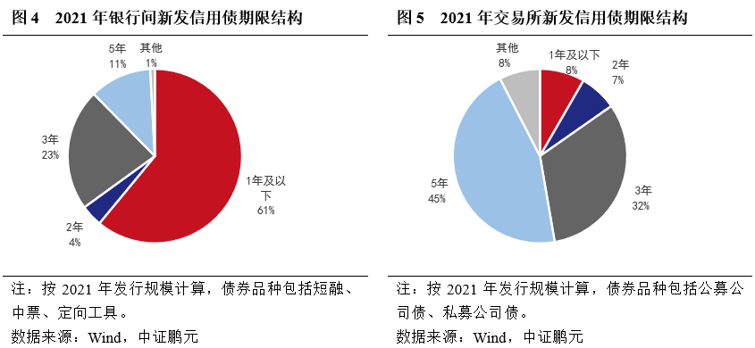2020年5月,交易所債券市場開始試點(diǎn)短期公司債券。此前交易所債券市場缺乏短期限品種所致的兩市場期限結(jié)構(gòu)差異的現(xiàn)場仍然存在。從2021年的新發(fā)行債券來看,不考慮跨市場品種,銀行間信用債加權(quán)期限為1.70年,交易所信用債加權(quán)期限為4.01年。期限結(jié)構(gòu)上,銀行間信用債以1年期以下短期債券為主,發(fā)行規(guī)模占比61%,5年期及以上長期限債券的發(fā)行規(guī)模占比僅為12%;交易所信用債則以長期限為主,1年期及以下短期債券發(fā)行規(guī)模占比為8%,5年期及以上長期限債券的發(fā)行規(guī)模占比為51%。