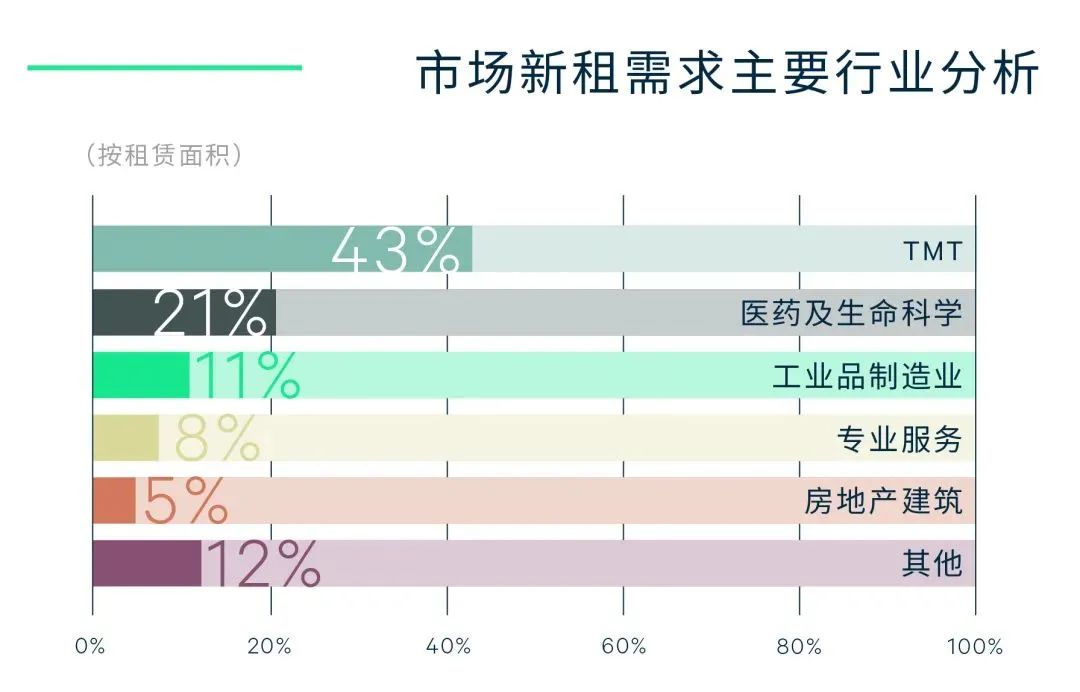 需求端看,一季度,金融重回新租需求行業(yè)榜首(占比32%),其中證券、基金以及金融科技擴(kuò)租需求強(qiáng)勁。TMT的新租需求則集中在軟件開(kāi)發(fā)、互聯(lián)網(wǎng)+消費(fèi)服務(wù)及人工智能等領(lǐng)域。