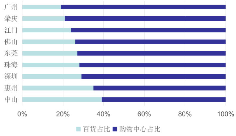 從城市人均購物中心數量和社零的對比來看,廣州、深圳社零基本面較好,城市整體商業面積仍未滿足人口消費需求,天花板較高,商業仍有發展空間。而中山、惠州、佛山、東莞市場飽和已顯現,珠海、肇慶、江門仍處于購物中心稀缺階段。