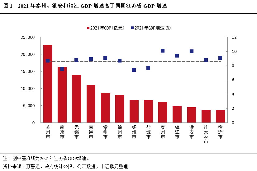 2021年蘇州、南京和無錫GDP規模繼續處于領跑地位,但泰州、淮安和鎮江GDP增速高于同期江蘇省GDP增速。2021年江蘇省13個地級市GDP規模均有所提升,但排位順序未發生變化。從GDP規???,2021年GDP規模突破萬億的地級市依舊是蘇州、南京、無錫和南通,數量較2020年無變化。2021年,蘇州、無錫和南京GDP總和占江蘇省GDP的45.61%,較2020年下降0.49個百分點。蘇北地區中宿遷、連云港和淮安GDP規模依舊偏弱,依舊處于省內最后三位。從GDP增速來看,2021年由于疫情得到有效控制,各地級市GDP增速均高于2020年。2021年,南京、揚州和鹽城GDP增速低于同期江蘇省GDP增速,泰州、淮安和鎮江雖然廣義債務負擔較重,但2021年GDP增速明顯高于同期江蘇省GDP增速,其余地級市GDP增速基本和江蘇省GDP增速持平。
