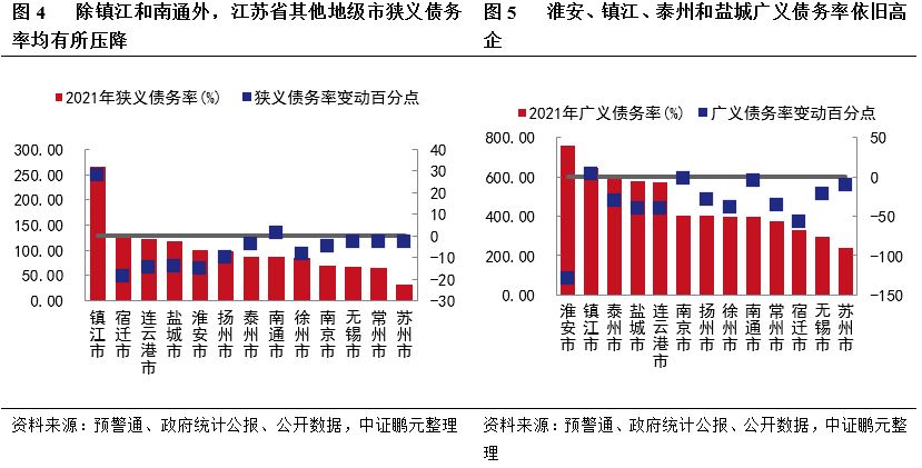 財政自給率方面,2021年蘇州和鎮江財政自給率較2020年分別下滑4.59個百分點、2.20個百分點至97.15%和60.29%,無錫和揚州財政自給率基本和2020年持平,宿遷財政自給率提升較為明顯,2021年宿遷財政自給率上升8.28個百分點至45.80%,主要系2021年宿遷綜合財力較2020年增加明顯,且一般公共預算支出變動不大所致。