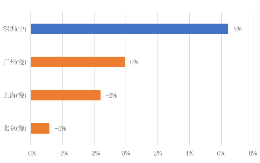 一線城市中,除深圳外,其余三市均為人才“緩增型”城市,即大學生數量占常住人口規(guī)模的比例增速均在60%以下。從四個城市近十年商品住宅成交規(guī)模復合增長率可以看出,大學生數量占比增幅最大的深圳近十年商品住宅成交規(guī)模復合增速達6%,顯著高于“緩增型”城市北上廣。