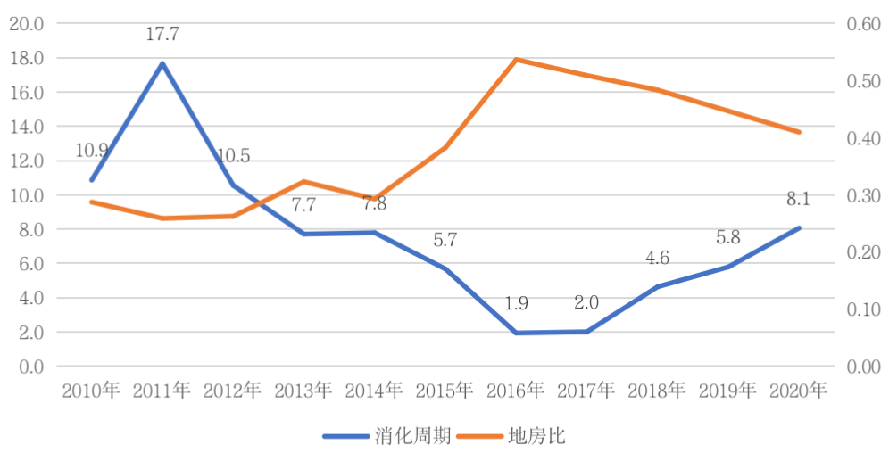 圖3.2  2010年以來武漢市商品住宅消化周期和年度成交地房比走勢(月)