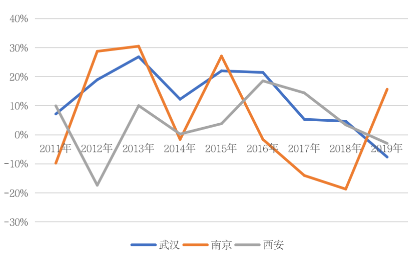 圖4.2  2011年~2019年武漢、南京和西安住宅成交面積同比走勢