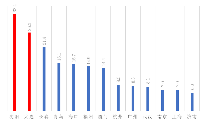 從區(qū)域分布來看,這些城市多以北方二線城市為主,近年來經濟發(fā)展速度相對沿海二線較慢,高收入的新興產業(yè)發(fā)展速度較慢,因此在人才爭奪戰(zhàn)中也處于下風,如天津、濟南、長春和哈爾濱等城市近十年大學生比例漲幅均處于二線城市下游。在此影響下,這些城市的房價上漲動力也比較薄弱,整體增速偏緩,如哈爾濱2020年商品住宅成交均價仍未破萬,近十年房價復合增長率僅有6%。