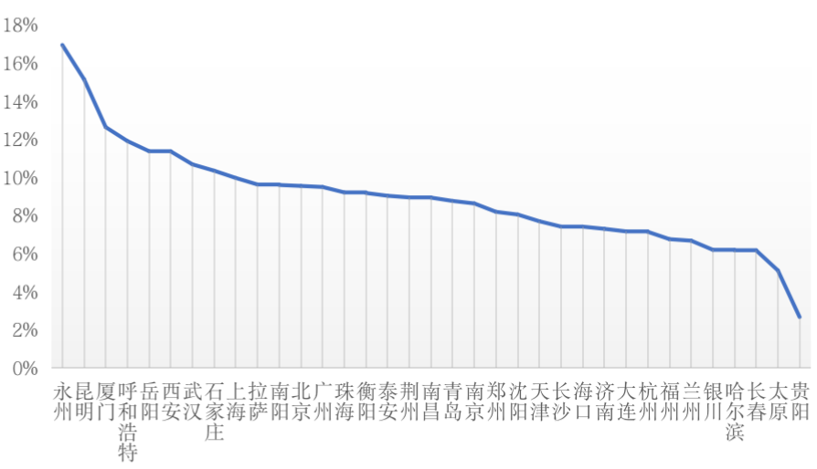 2、“低位緩增”型:大學生占比低于20%的城市,主要以三線城市為主,但哈爾濱、石家莊、福州等二線城市也均在列。