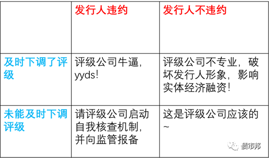 因為債券一旦違約,發行人的外評是直接掉到CCC及以下,而往上推3個子級,意味著如果不能在違約前將評級符號下調到BBB,都是失職的。現在能在發行人首次違約前,將其評級下調到BBB的評級公司還是鳳毛麟角。