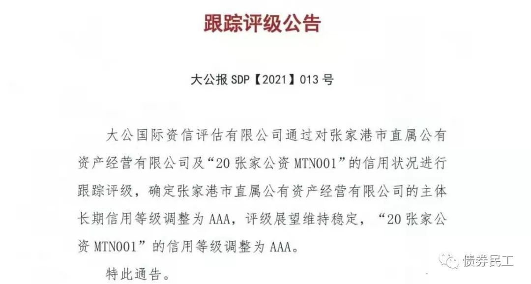 根據大公國際2021年6月3日披露的跟蹤評級公告,將張家港市直屬公有資產經營有限公司的主體長期信用等級由AA+調整為AAA,成為2021年第3個主體信用評級調升至AAA的發行人,也是2021年唯一一個主體主體信用評級調升至AAA的城投公司。