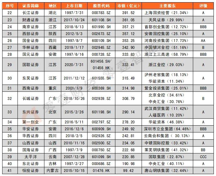 同時在A股和H股上市的有13家,其中,海通證券、光大證券、東方證券、國泰君安注冊地為上海,中國銀河、中信建投、中金公司注冊地為北京,注冊地為廣東的分別為中信證券、廣發證券、招商證券,華泰證券、國聯證券注冊地為江蘇,中原證券注冊地為河南。