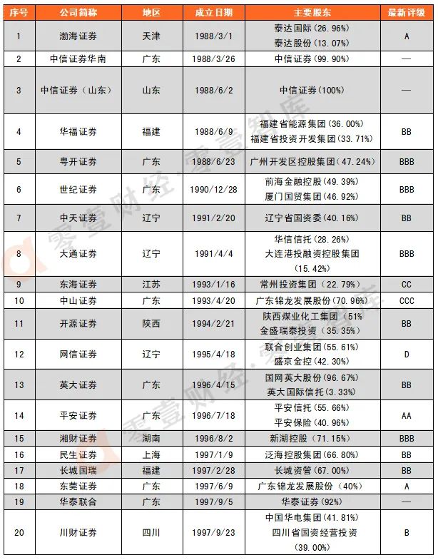 在2020年證監會評級中,未上市券商中有57家參與評級,A類(AA類3家,A類14家)評級的有17家;B類(BBB類16家,BB類9家,B類4家)評級29家;C類(CCC類評級5家,CC類4家,C類1家)評級10家;D類評級1家。