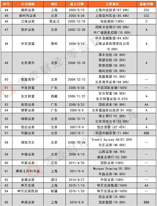 根據《證券公司分類監管規定》,證券公司分為A(AAA、AA、A)、B(BBB、BB、B)、C(CCC、CC、C)、D、E等5大類11個級別。A、B、C三大類中各級別公司均為正常經營公司,其類別、級別的劃分僅反映公司在行業內業務活動與其風險管理能力及合規管理水平相適應的相對水平。D類、E類公司分別為潛在風險可能超過公司可承受范圍及因發生重大風險被依法采取風險處置措施的公司。