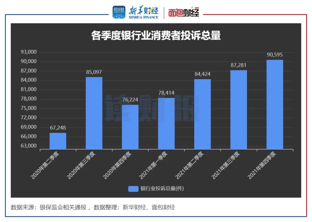 統計數據顯示,2021年銀保監會處理銀行業消費投訴340714件。其中,第四季度處理投訴90595件,環比增長3.8%。2021全年各季度處理投訴量呈現出同比、環比均逐季增長的趨勢。