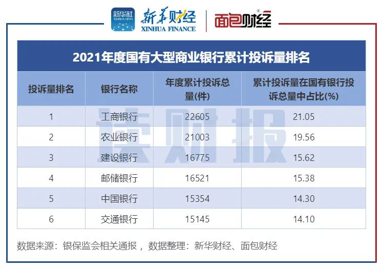 從年度數據看,2021全年國有銀行中消費者累計投訴量前三名的分別是工商銀行、農業銀行和建設銀行。