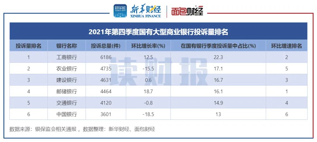 與第三季度相比,郵儲銀行投訴量環比增長18.7%,增速排名第一;工商銀行以12.5%的增速,排在第二位。
