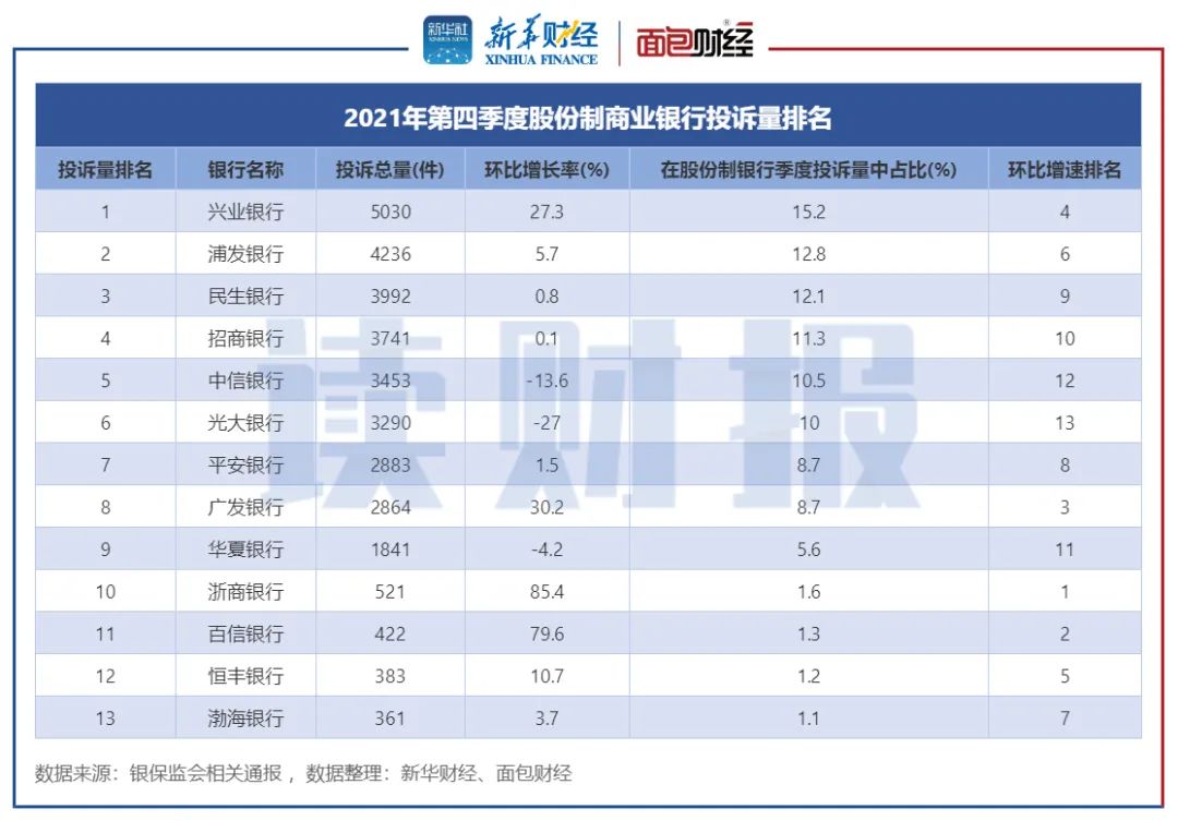 2021年第四季度,興業銀行、浦發銀行和民生銀行的消費者投訴量位居股份制銀行前三名。其中,興業銀行投訴總量高達5030件,是唯一一家季度投訴量超過5000件的股份制銀行。