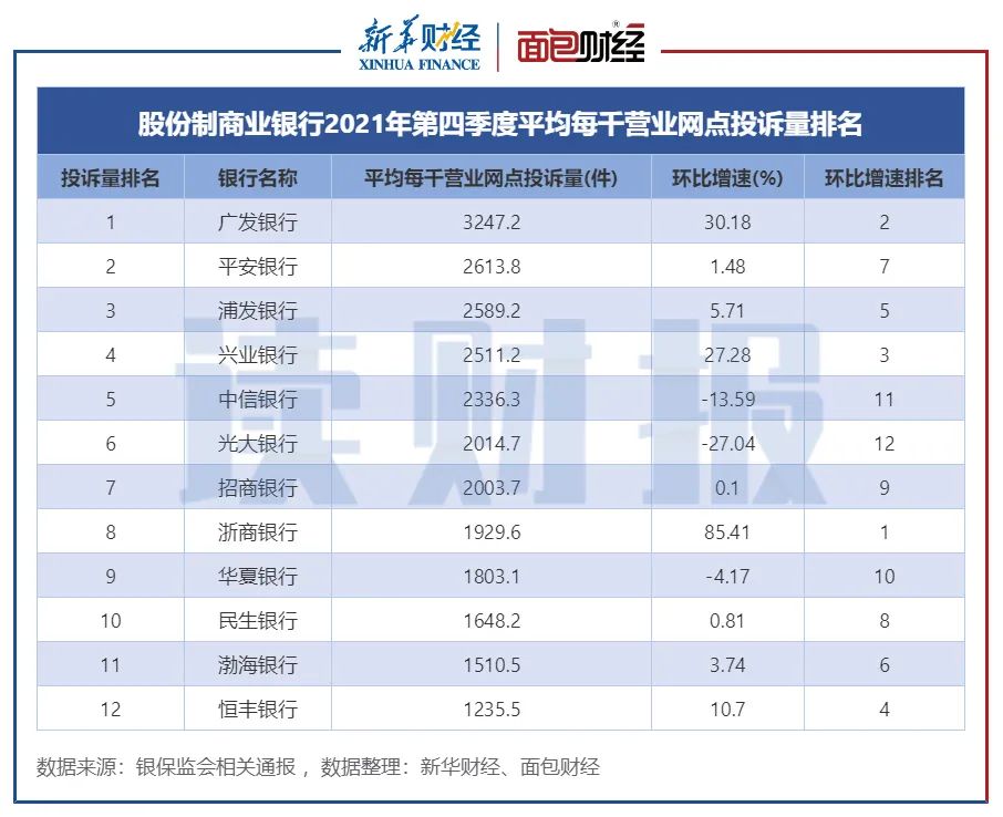 以平均每千營業網點投訴量進行統計,廣發銀行位居股份制銀行首位,2021年第四季度該行平均每千營業網點投訴量3247.2件,遠高于其他股份制銀行。平安銀行和浦發銀行位列第二和第三。