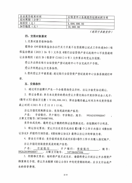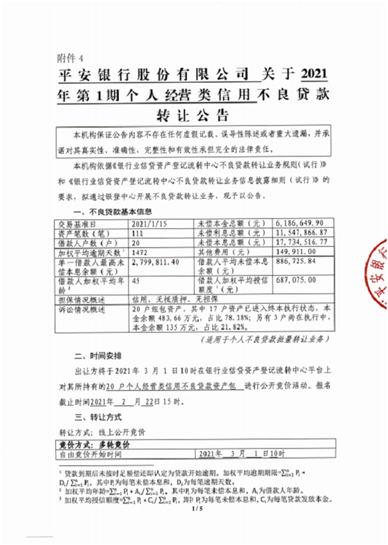 2月8日,平安銀行和工商銀行分別在銀登網上發布了其首個個人不良貸款轉讓公告。兩家銀行不約而同的選在了3月1日采用多輪競價的方式進行競價轉讓,并按《信息披露細則》的規定和附件1《不良貸款轉讓公告》模板,在公告中披露了不良貸款基本信息。