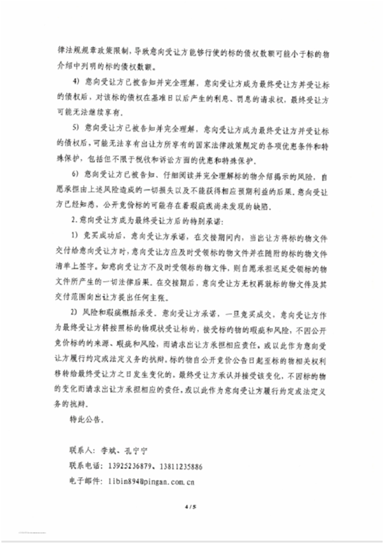 平安銀行首期轉讓的標的即是該行1月25日發布的《擬轉讓簡介》標的。從轉讓公告中可以看出:該批標的為個人經營類信用不良貸款,共20戶,其中17戶已終本,3戶執行中,逾期天數(按未嘗本息總額加權平均)1472天。未嘗本金總額約619萬元,未嘗利息總額約1155萬元,未嘗本息總額約1773萬元,起始價100萬元,加價幅度3萬元。