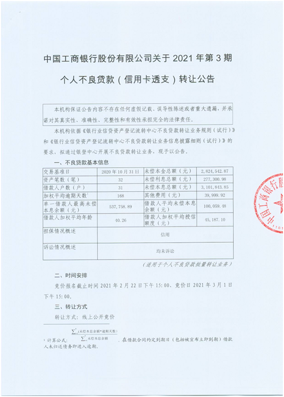 工商銀行第3期轉讓的標的亦為信用卡透支類不良貸款,共31戶(32筆),均未訴訟,逾期天數(按未嘗本息總額加權平均)168天。未嘗本金總額約2825萬元,未嘗利息總額約277萬元,未嘗本息總額約3102萬元,競價起始價0元,加價幅度10萬元。