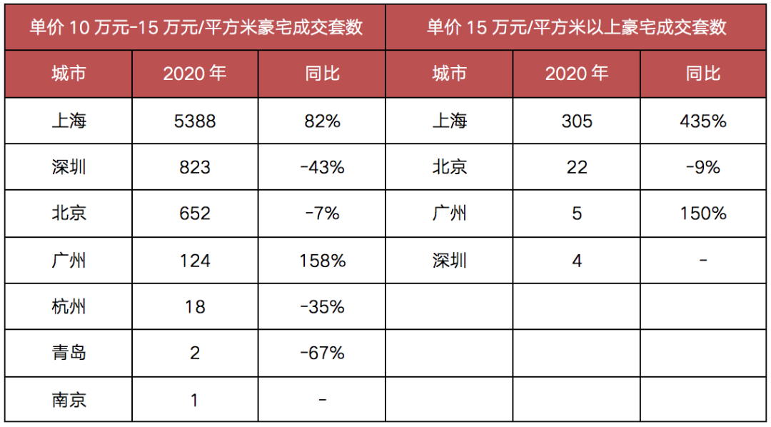 具體來看,單價10萬元-15萬元/平方米的豪宅成交套數(shù),上海為其他所有成交套數(shù)的3倍。單價15萬元/平方米以上豪宅成交套數(shù),上海是其他所有城市的10倍。