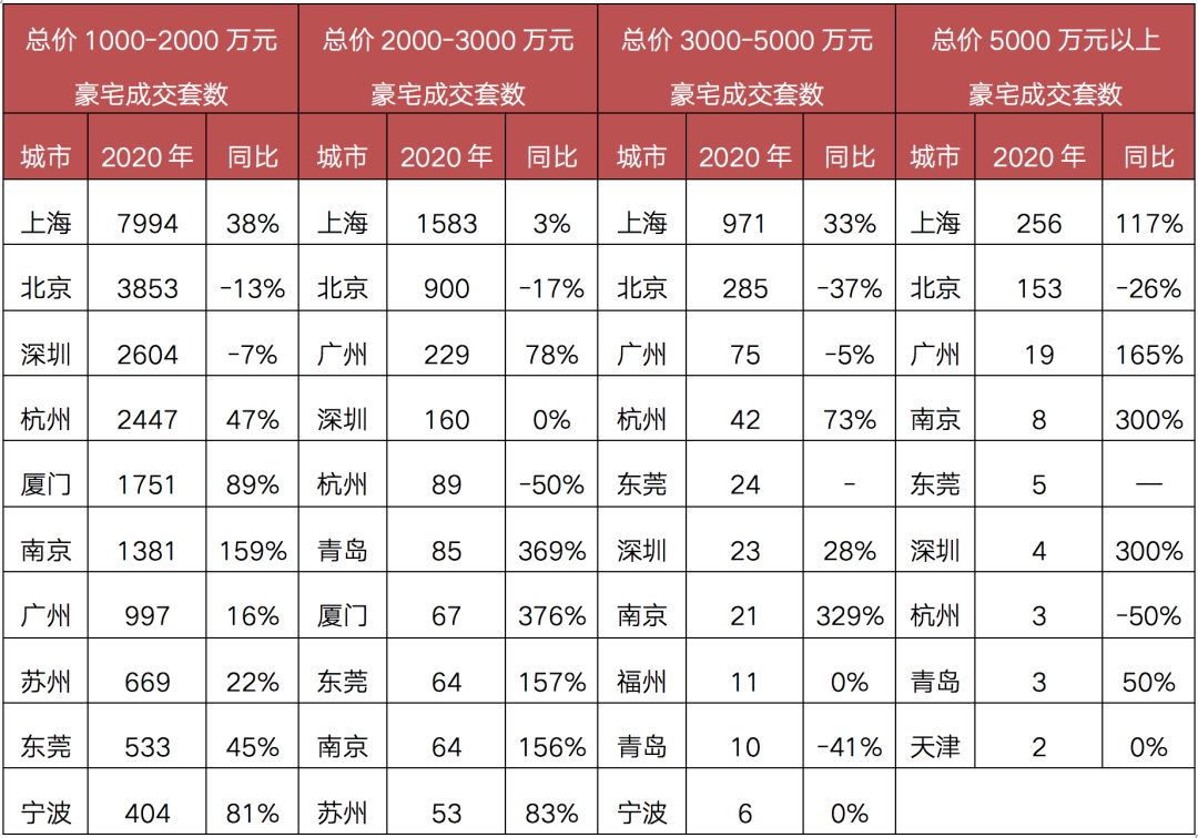 從總價來看,5000萬元以上豪宅,上海2020年共成交256套,高于排名第二的北京100多套,總價3000-5000萬元豪宅成交上海約為其他所有成交的2倍,其他總價1000-3000萬的豪宅成交來看,上海也在全國保持遙遙領(lǐng)先。