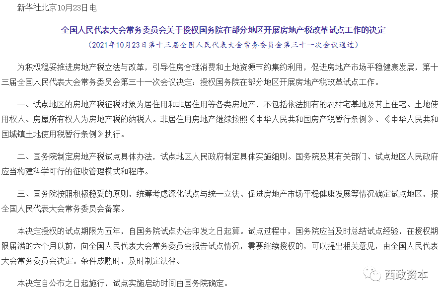 2021年10月23日,第十三屆全國(guó)人大常委會(huì)第三十一次會(huì)議作出決定,授權(quán)國(guó)務(wù)院在部分地區(qū)開(kāi)展房地產(chǎn)稅改革試點(diǎn)工作。