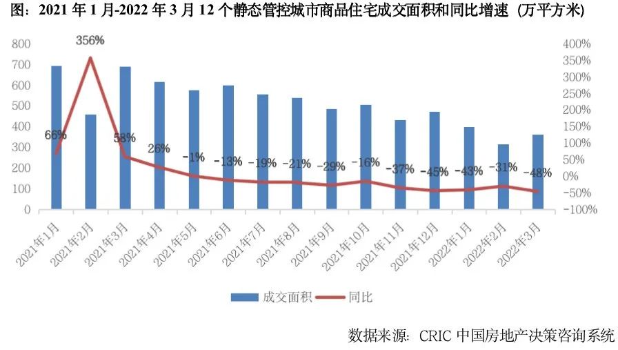 靜態(tài)管控城市樓市近乎停擺,成交加速下滑。3月,12個(gè)靜態(tài)管控城市商品住宅成交面積362萬平方米,同比下跌48%,跌幅較2月擴(kuò)大17個(gè)百分點(diǎn)。