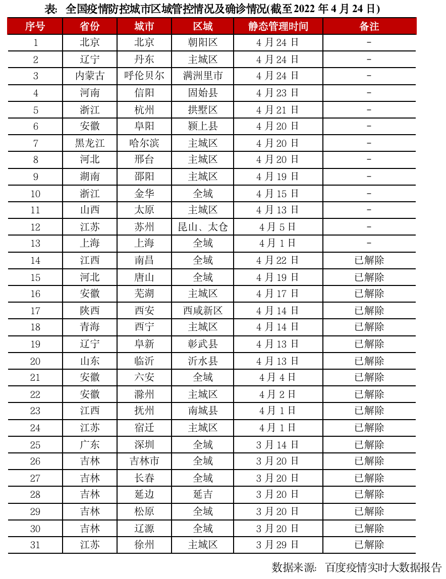 3月以來,超過30個(gè)城市緊急發(fā)布靜態(tài)管理疫情防控公告,其中,蘇州、太原等城市僅在疫情高發(fā)的重點(diǎn)區(qū)域?qū)嵭泄芸兀虾!⑸钲凇㈤L春等實(shí)行全域靜默管理,期間全城非必要經(jīng)營活動(dòng)暫停,房地產(chǎn)市場也因此幾乎陷入停擺。截至4月24日,仍有13個(gè)城市處在局部或全域靜態(tài)管控當(dāng)中,全國尚存在111個(gè)中高風(fēng)險(xiǎn)地區(qū)。