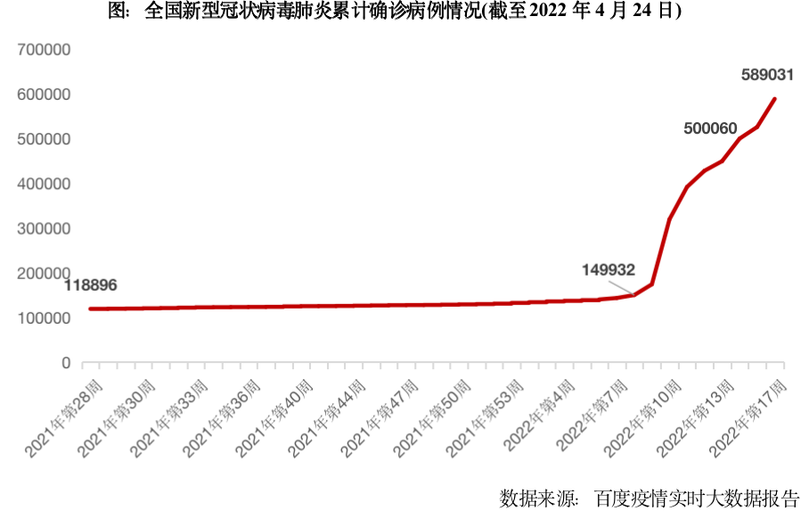 2月下旬以來,全國新冠確診病例數(shù)呈快速攀升走勢,累計(jì)確診病例數(shù)突破50萬。截至4月24日,全國(含港澳臺(tái))報(bào)告累計(jì)新型冠狀病毒肺炎確診病例58.9萬例,較一周前增加6.3萬例,較2022年初增加45萬例,累計(jì)死亡病例14881例,較年初增加近1萬例。