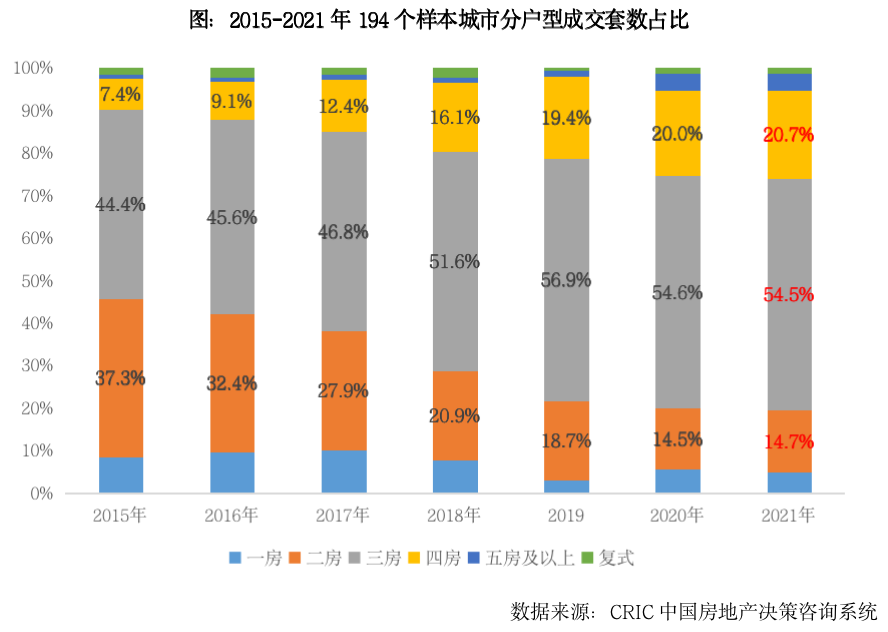 受限貸政策影響,大量改善性需求被壓制。2021年,改善性需求相對堅(jiān)挺,據(jù)CRIC重點(diǎn)監(jiān)測的 194個(gè)樣本城市成交結(jié)構(gòu)數(shù)據(jù)顯示,三房成交套數(shù)占比高達(dá)54.5%,四房成交占比穩(wěn)步提升至20.7%。但受限貸政策影響,不少城市二套房首付比例都在50%以上,部分城市更是達(dá)到70%乃至80%,很大程度上提升了改善性客群首付款支出壓力,大量改善性需求被壓制。