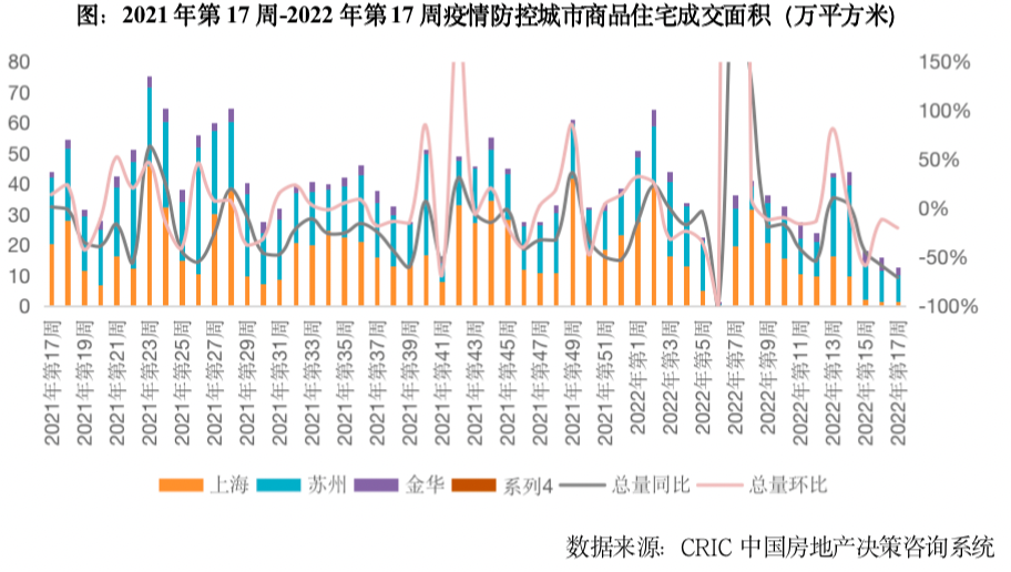 第17周,3個(gè)尚在靜態(tài)管控中的城市,新房成交面積共計(jì)13萬平方米,僅為2022年周平均規(guī)模的1/3,環(huán)比下跌20%,同比跌幅擴(kuò)大至71%。