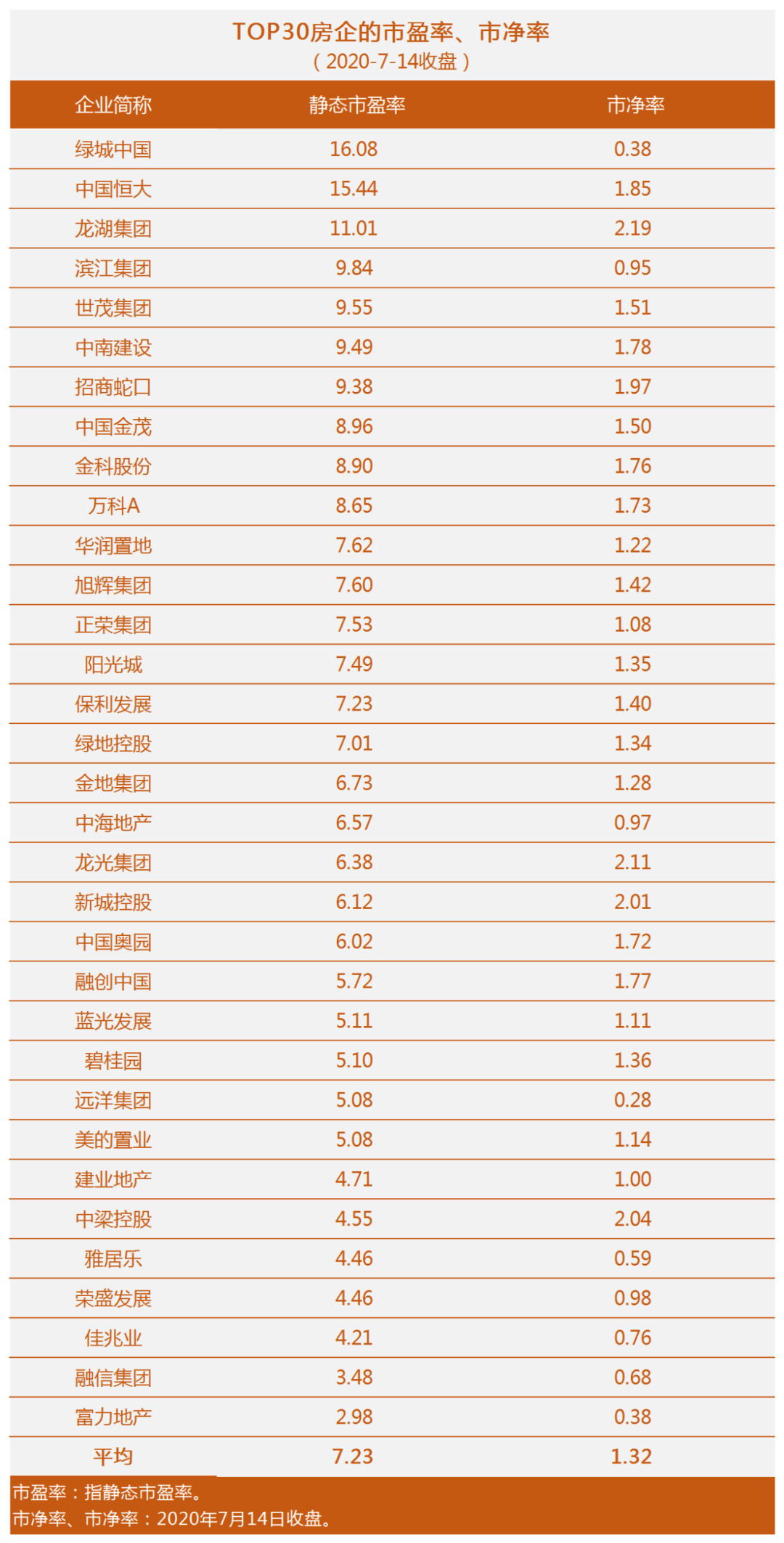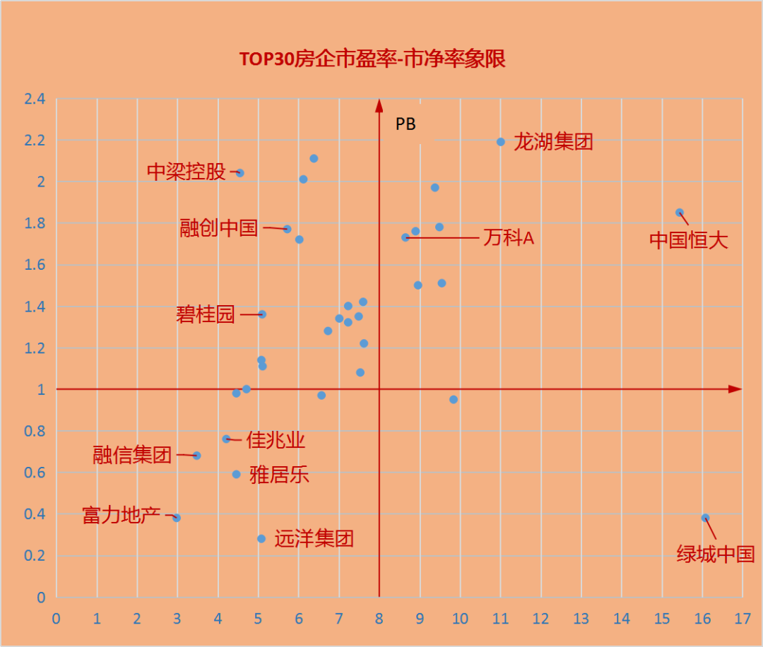 以市凈率1.0、市盈率8.0為坐標原點。對TOP30房企進行分類。