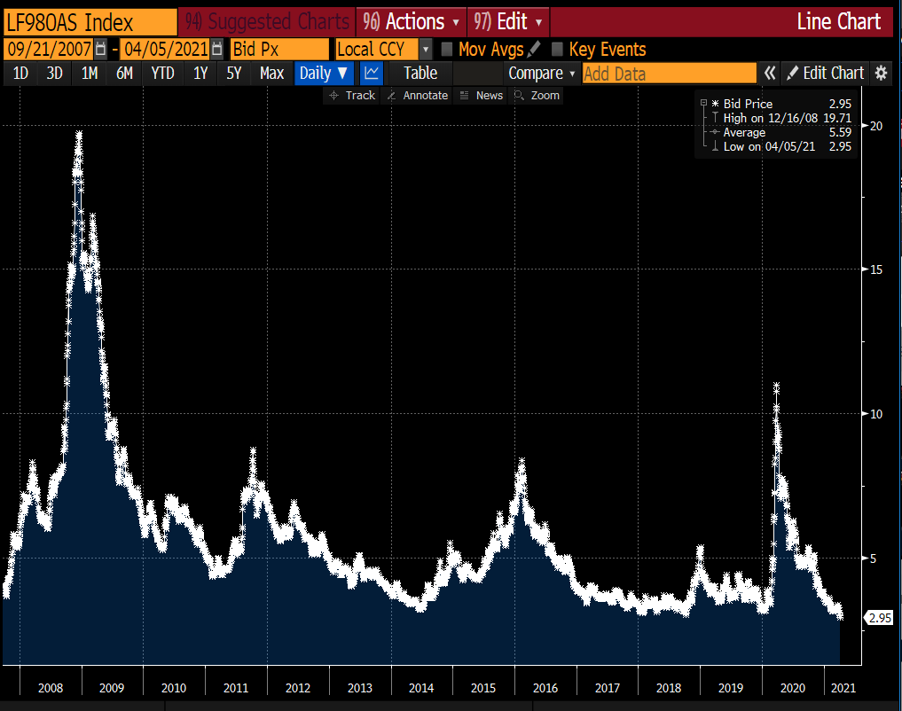 需求端,疫情以來美聯(lián)儲(chǔ)持續(xù)進(jìn)行量化寬松,以每個(gè)月1200億美元的節(jié)奏購買美國(guó)國(guó)債及房貸支持證券,對(duì)美元債券市場(chǎng)釋放了天量的流動(dòng)性。在美國(guó)經(jīng)濟(jì)重啟、通脹大幅抬升的背景下,美聯(lián)儲(chǔ)至今沒有釋放縮減購債的信號(hào)。這也進(jìn)一步抬升了投資者的風(fēng)險(xiǎn)偏好,使得美國(guó)垃圾債到期收益率低于4%、信用利差低于300bps的歷史最低位,也形成了市場(chǎng)對(duì)大量低評(píng)級(jí)甚至無評(píng)級(jí)的中資地產(chǎn)美元債的強(qiáng)勁需求。