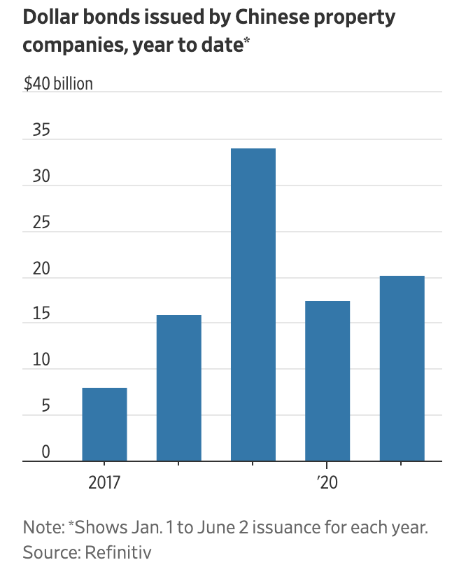 據(jù)Refinitiv數(shù)據(jù)顯示,2021年前五個(gè)月中國(guó)房地產(chǎn)公司已經(jīng)發(fā)行203億美元的債券,較去年同期增長(zhǎng)16%,在過去五年同期比較中僅次于2019年。高收益?zhèn)耐顿Y者競(jìng)爭(zhēng)認(rèn)購中資地產(chǎn)美元債,仿佛對(duì)正在發(fā)生的商票逾期、個(gè)體違約、樓市調(diào)控趨嚴(yán)都視若罔聞。