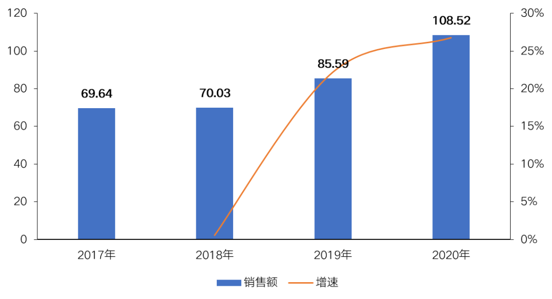 圖:2017-2020年融創廣西區域銷售規模與增速(億元)