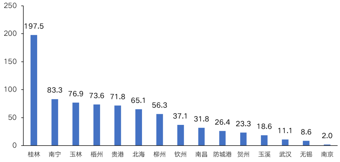 在這其中,位于廣西的土地儲備量和占比都不高,截至2020年末,融創在廣西的土地儲備主要位于南寧和桂林,總計達到371.66萬平方米,占總土儲1.4%,權益土地儲備為280.64萬平方米。