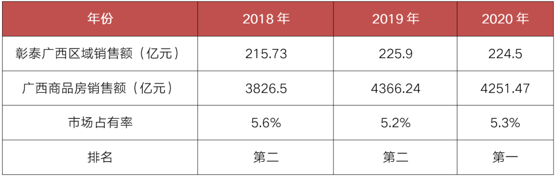 彰泰作為廣西規模最大的本土房企,2018-2020年連續三年銷售額均超過200億元,其中2020年在廣西區域全口徑銷售額達224.5億元,權益銷售金額達161.4億元,均位列第一。根據廣西2020年商品房銷售額4251.5億元計算,市場占有率約為5%,超過碧桂園位居首位。今年一季度,彰泰繼續以47.44億元領跑,增長預期向好。