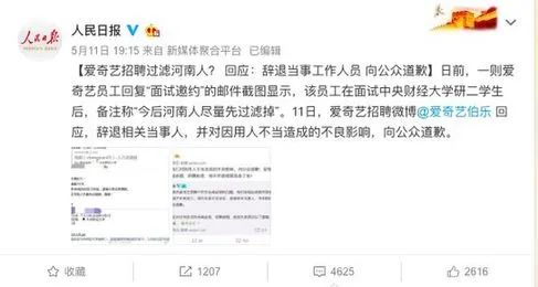 17年5月,愛奇藝被爆出在招聘中地域歧視。被爆出的郵件顯示,愛奇藝一位工作人員在面試了中央財經(jīng)大學一名學生后,給在人力資源部回復中備注“今后河南人盡量先過濾掉,謝謝!