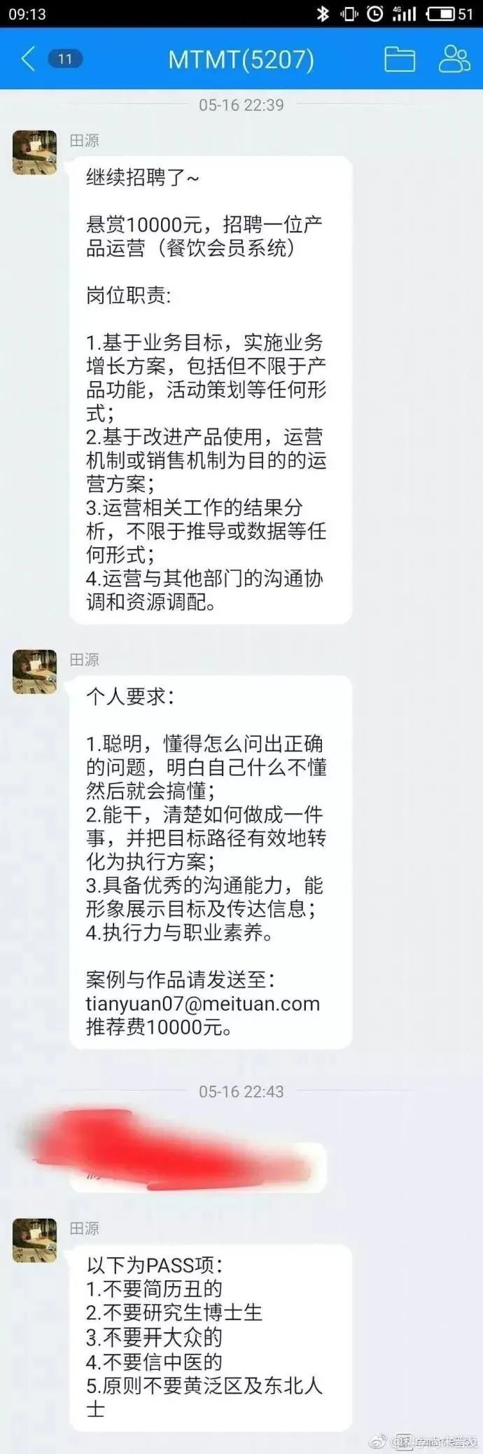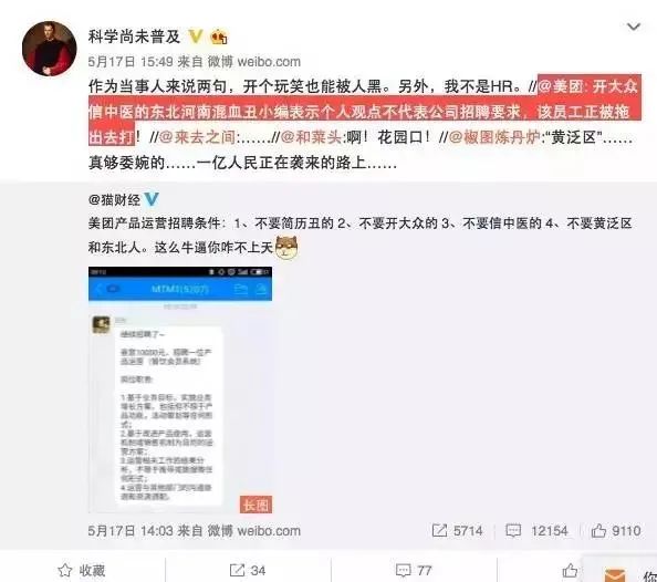 2017年5月,美團內部的一則招聘截圖流出,截圖顯示,一位名叫田某的小領導要招一個運營,提出了他的5個不要:不要簡歷丑的;不要研究生博士生;不要開大眾的;不要信中醫(yī)的;原則上不要黃泛區(qū)和東北人。消息雖然是發(fā)在公司內網(wǎng),但截圖很快流出,引起口誅筆伐,為美團帶來海量的負面報道。