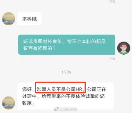 今年4月,杭州某企業(yè)招聘人員在招聘網(wǎng)站應聘者溝通時,表示“考不上本科的都是智商有問題的”,由此掀起網(wǎng)友口誅筆伐的熱議,該公司也因此“出名”。