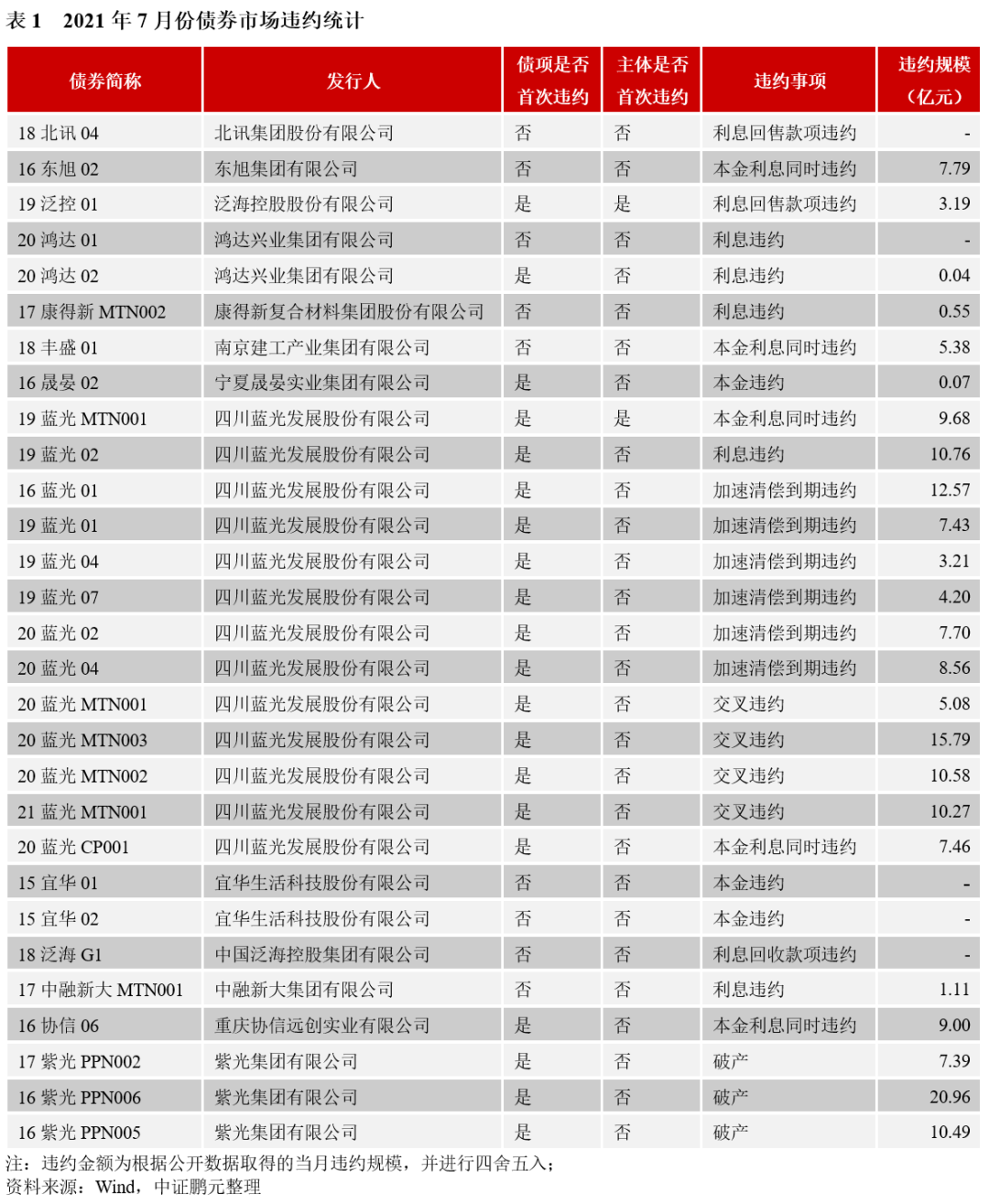 不完全統計,2021年7月份信用風險事件[1]有29次,涉及13家發行人。其中,首次違約的主體有2家,分別是泛海控股股份有限公司(簡稱泛海控股)、四川藍光發展股份有限公司(簡稱藍光發展),較上月減少3家。具體看首次違約債券特征: