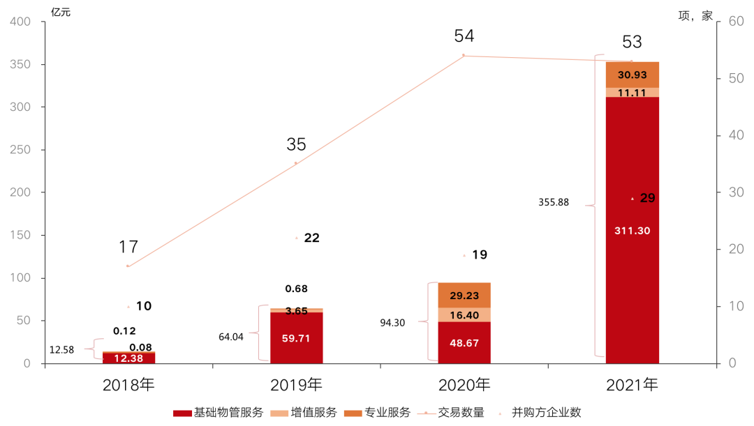2021年,物業(yè)行業(yè)并購市場(chǎng)火熱,據(jù)克而瑞物管和中物研協(xié)數(shù)據(jù),截至2021年12月31日,共有29家上市物企發(fā)起53項(xiàng)并購,并購交易總額達(dá)355.88億元。