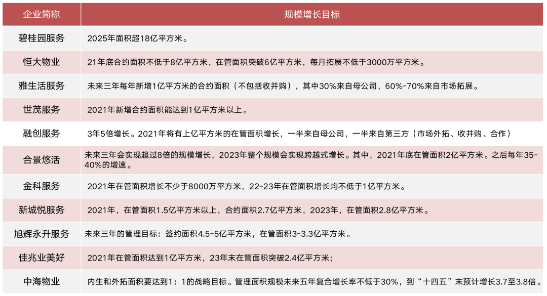 從企業(yè)端來看,迫切擴(kuò)規(guī)模的需求,驅(qū)動(dòng)企業(yè)發(fā)起并購。在年初,多家物企即披露了未來三至五年規(guī)模擴(kuò)張目標(biāo),為全年的規(guī)模擴(kuò)張?zhí)岢鲋敢H纾暇坝苹钤诠芤?guī)模3年8倍;世茂服務(wù)提出規(guī)模3年5倍;恒大物業(yè)2021年在管面積將破6億平方米,合約面積不低于8億平方米;碧桂園服務(wù)則表示2025年規(guī)模超18億平方米等。