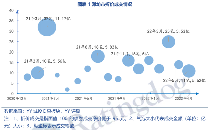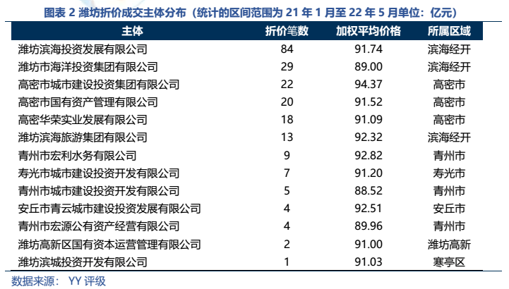 (1)從成交來看,濰坊折價成交頻繁(2022年5月共11筆折價,金額合計5.62億元),規(guī)模甚至高于湖南等省份全省,主要集中在濱海經(jīng)開區(qū)和高密市。
